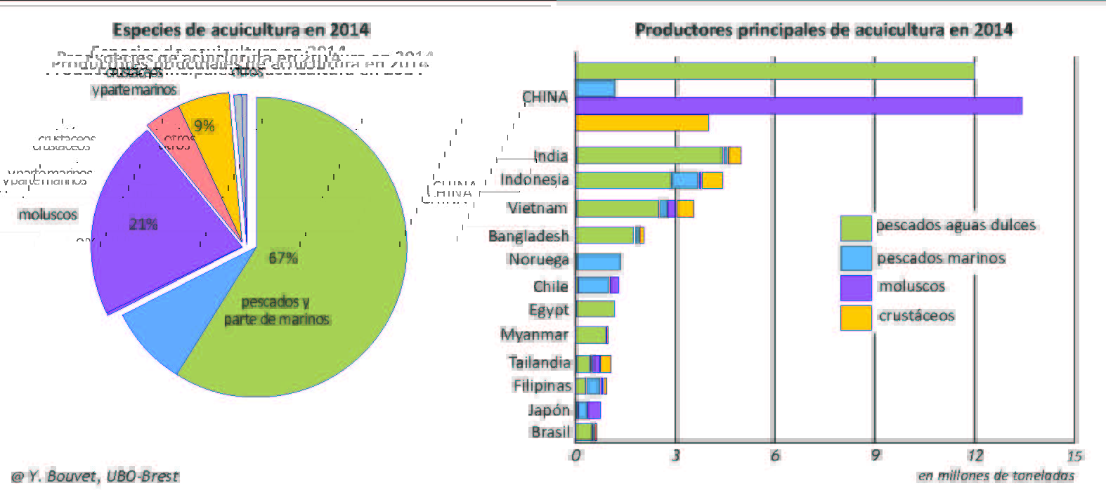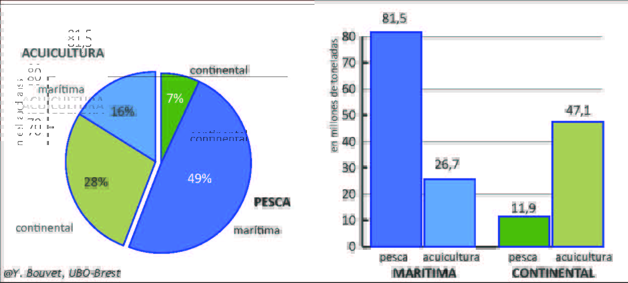 Desde la década de 1990, la acuicultura ocupa año tras año un lugar cada vez más importante en la producción de productos del mar, como una repuesta a la estagnación de la pesca. Con 74Mt en 2014 (y más de 27Mt de plantas acuáticas), 44% de la producción anual total viene de la acuicultura y se ha vuelto necesaria para la alimentación humana, aunque la minoría se produzca en los espacios marinos, solamente 27Mt (gráfico 9). El crecimiento de la producción es consecuencia del control del ciclo de vida y de reproducción en circuito cerrado. La ganadería de aguas dulces existe desde hace siglos, como marisquero, pero la ganadería de especies marinas es más reciente, con algunos pescados (salmón) o crustáceos (camarones). En 2014, la acuicultura da la misma cantidad de peces que la pesca para el consumo humano, con 580 especies diferentes y 35 países que producen más en acuicultura que en pesca; entre estos los 5 grandes países de producción: China (45Mt), India, Vietnam, Bangladesh y Egipto. El 90% de la producción se hace en Asia, con una acuicultura de camarones en casi todos los países del continente (como también en África del Este, y en América tropical).