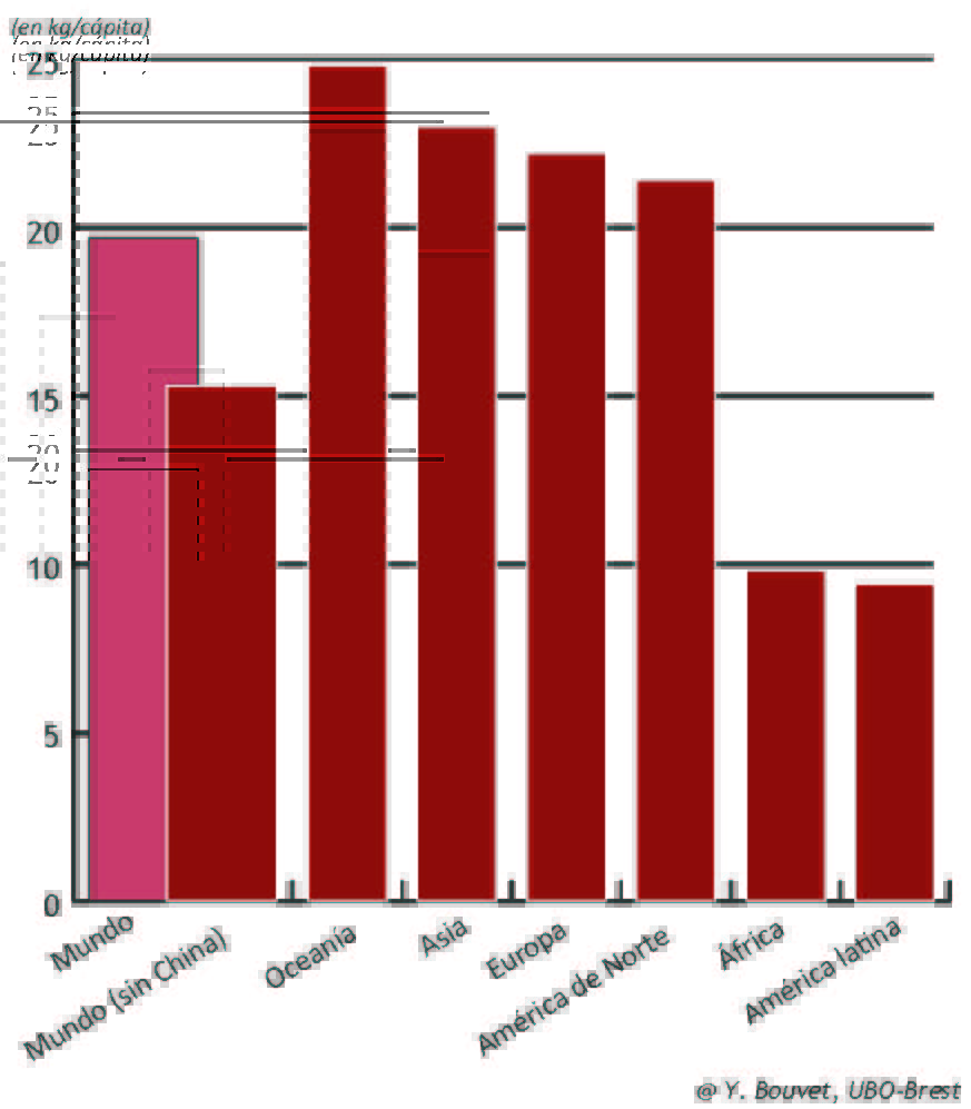 El crecimiento más importante ‑el de China, con 38 kg/habitante en 2014‑, disminuye considerablemente la disponibilidad para otros países. China tuvo una producción de acuicultura, de pesca y de importaciones de productos muy fuerte en los últimos años debido al aumento del nivel de vida y de una fuerte urbanización. Sin China, el consumo es un poco menos elevado: un 15 kg/cápita.