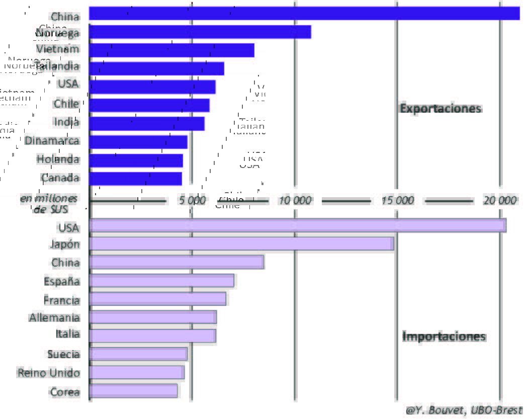 Con el gráfico de intercambios de pescados (gráfico 13), podemos reconocer las desigualdades de distribución y consumo. Visualizamos a China como el país con mayor importación y exportación de productos del mar, junto a otros países de Asia. Vemos también países del Norte que exportan pescados de menor valor o pescados que deben sufrir transformaciones posteriores en países de mano de obra barata. Hay también países dedicados a la acuicultura como Noruega y Chile que exportan salmón. Los países importadores son países ricos. El primero es Estados unidos, seguido por Japón y Europa. El mercado mundial se construye sobre dos tipos de producción: una producción de peces para hacer harina (pequeños peces pelágicos) y sostener la acuicultura y ganadería intensiva; y la producción de pescados salvajes de valor (tuna, pescados blancos como colín, bacalao, merluza) o de acuicultura (salmón, camarones). Pero el sistema de producción y de intercambios crea una multitud de actores y de espacios que podemos conceptualizar con la mirada de la geografía.