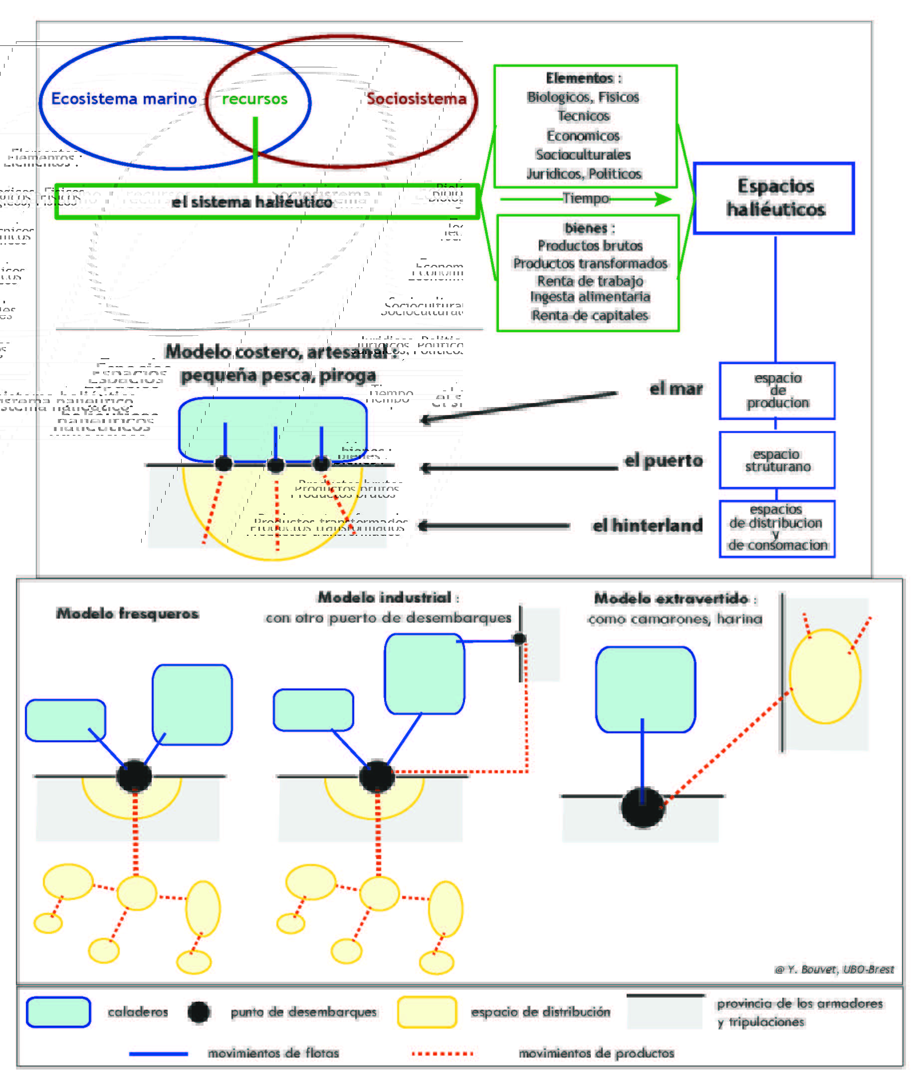 El geo-sistema haliéutico [Corlay 1993] constituye el encuentro entre el ecosistema y el socio-sistema, que se conforma sobre recursos marinos. Necesita de muchos elementos para existir. Elementos diferentes según el tipo de pesca. Pueden ser elementos biológicos, físicos, técnicos, económicos, socio-culturales, jurídicos, políticos, etc. El sistema produce bienes, bienes de productos brutos, transformados, renta de trabajo, renta del capital, ingesta alimentaria. Con el paso del tiempo se crean los espacios haliéuticos, espacios de producción (pesquerías), espacios de distribución (continentales o intercambios) que estructuran los puertos y las costas para las actividades antes y después de la pesca. Generalmente, podemos observar espacios diferentes para cada tipo de pesca en el mar. En la costa (caladeros y artes de pesca); en el puerto, donde se realizan actividades de preparación de la pesca (muelles, astilleros, avituallamiento de buques, y plantas de transformación de pescados) y donde viven los pescadores; y en el interior, el hinterland, donde se concreta la distribución y consumo de los productos de mar (gráfico 14).