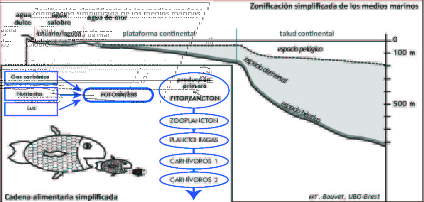 Con océano mundial de 361 millones de km2 y aguas continentales 3.5 millones de km2, la hidrósfera representa el 71% del mundo entero. Sin embargo, las aguas tienen una baja productividad y producen menos del 2% del alimento humano [Carré 2008]. Según distintos antiguos autores, la predicción del nivel máximo de producción para el consumo humano es de 120 a 150 millones de toneladas obtenidas a través de la pesca marítima [Cury y Miserey 2008]. Para que la vida marina exista y se desarrolle es necesaria la convergencia de diversos factores e insumos, prácticamente los mismos que se necesitan en el continente. El ciclo biológico se basa sobre la fotosíntesis y distintos procesos complejos que permiten el inicio de la vida y la co-habitabilidad de fitoplancton, zooplancton y otros animales herbívoros y carnívoros. La cadena alimentaria puede ser una descripción simplista de que el pez más grande se come al pez más pequeño. Para tener un medio rico en el mar, debemos tener en cuenta diferentes factores tal como la temperatura, la salinidad, el oxígeno y la luz, que construyen la distribución de la vida. Podemos obtener una clasificación de las zonas marinas analizando su profundidad: una zona pelágica en la superficie, la zona béntica en el fondo y la llamada zona demersal, situada entre las dos antes mencionadas (gráfico 2). Podemos, además, hacer una zonación vertical de la fauna y flora, ya que con el aumento de la profundidad aumenta la oscuridad, el frío, la presión y disminuyen las posibilidades de una buena nutrición. En consecuencia, las zonas de plataformas continentales son las áreas más propensas para el desarrollo de la vida y casi toda la producción se realiza cerca de las áreas costeras [Doumenge 1965].