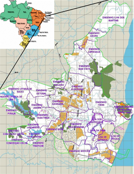 Figura 1. Localización de las 27 comunidades (engenhos) de campesinxs de lo que hoy es Suape, Cabo de Santo Agostinho e Ipojuca, Pernambuco, Brasil