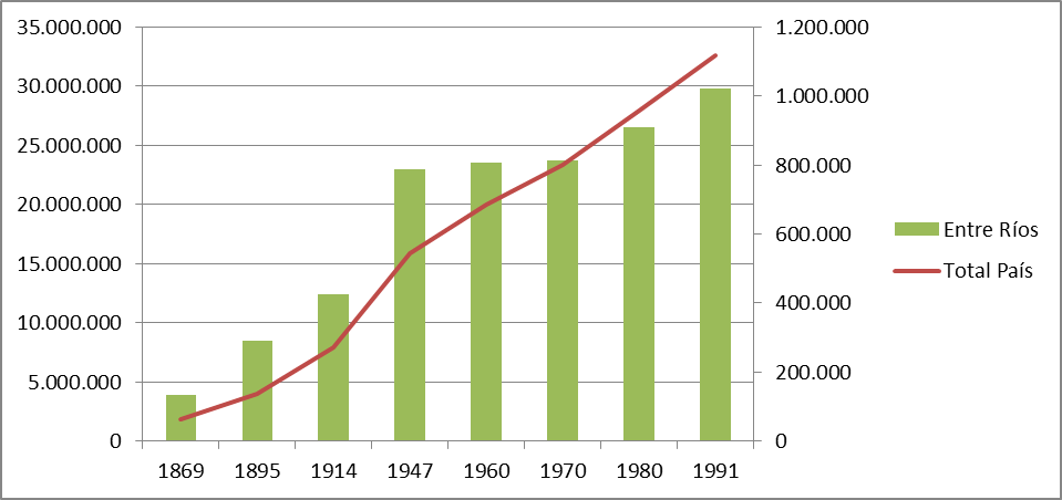 Como se ha sostenido reit­er­ada­mente, la población de la Argenti­na durante la primera mitad del siglo XX   se mul­ti­plicó expo­nen­cial­mente, mien­tras que la población de Entre Ríos sufrió un pro­ce­so de estancamien­to. En este sen­ti­do, se puede sosten­er que el movimien­to pobla­cional provin­cial se puede dividir en tres eta­pas, uno de poblamien­to ver­tig­i­noso entre 1869–1947, segui­do de otro en el cual hay estancamien­to y/o despoblamien­to entre 1947 y 1980, para retomar un crec­imien­to mod­er­a­do entre ese año y 2010 [Mateo, Rodríguez y Camar­da 2017]