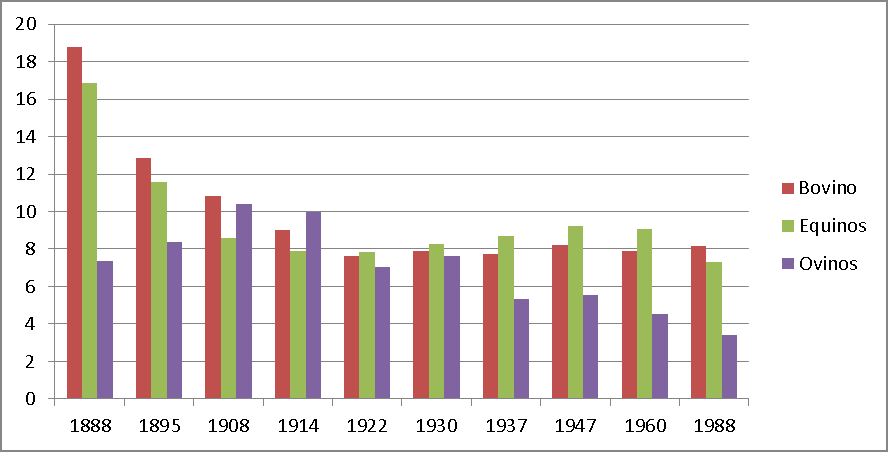 La dinámi­ca pobla­cional tuvo su cor­re­la­to en la pro­duc­ción agropecuar­ia, la cual man­tu­vo un pro­ce­so de estancamien­to pro­nun­ci­a­do durante la primera mitad del siglo XX.  Con respec­to a las dis­tin­tas pro­duc­ciones agropecuar­ias, sigu­ien­do lo obser­va­do por Rof­man y Romero [1990] para la dis­tribu­ción del PBI en las regiones y lo desar­rol­la­do de la población, en este sen­ti­do tam­bién tiene menor influ­en­cia. El desar­rol­lo de la ganadería, que había sido cen­tral durante el siglo XIX, en el siglo XX tuvo un estancamien­to muy mar­ca­do. La ganadería vac­u­na paso a la mitad a medi­a­dos de la déca­da de 1910 de la que existía en 1888 y se man­tu­vo has­ta la déca­da de 1990 en los mis­mos parámet­ros. Si bien, a prin­ci­p­ios del siglo XX, se puede obser­van un reem­pla­zo con el gana­do ovi­no, para la déca­da de 1920 decaen todas las pro­duc­ciones ganaderas.