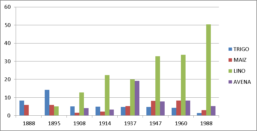 En cuan­to a la pro­duc­ción agraria se puede sosten­er que, a difer­en­cia de la ganadería que estu­vo un siglo XX de estancamien­to, que pro­gre­si­va­mente se incre­men­taron las can­ti­dades de hec­táreas cul­ti­vadas. Como ejem­p­lo de ello, tomamos cua­tro cul­tivos: tri­go, maíz, lino y ave­na y si obser­va­mos sal­vo el caso del tri­go (que a fines del siglo XIX era uno de los pocos cul­tivos y por ello pre­dom­i­nante) las otras tres pro­duc­ciones fueron incre­men­ta­do el ter­ri­to­rio cul­ti­va­do.  En par­tic­u­lar el lino y la ave­na tuvieron un desar­rol­lo sus­tan­ti­vo. En este sen­ti­do, quedará para futur­os tra­ba­jos estable­cer la relación de la pér­di­da de población a niv­el region­al y el incre­men­to de las super­fi­cies sem­bradas (que requieren may­or mano de obra que la ganadería) sien­do prob­a­ble en este sen­ti­do que gran parte de la población que migro en la déca­da de 1940 se encon­trara afin­ca­dos en las ciu­dades y pueb­los y no en el cam­po.