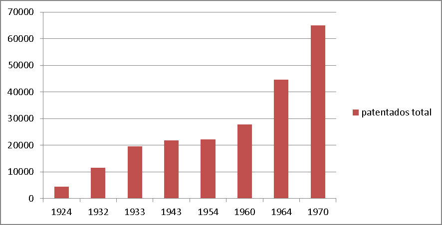 El paten­tamien­to de vehícu­los en Entre Ríos tuvo una dinámi­ca sim­i­lar a la desar­rol­la­da en la Nación, un crec­imien­to en la déca­da de 1930, un estancamien­to por la segun­da guer­ra mundi­al y a par­tir de la déca­da de 1960 un expo­nen­cial crec­imien­to.