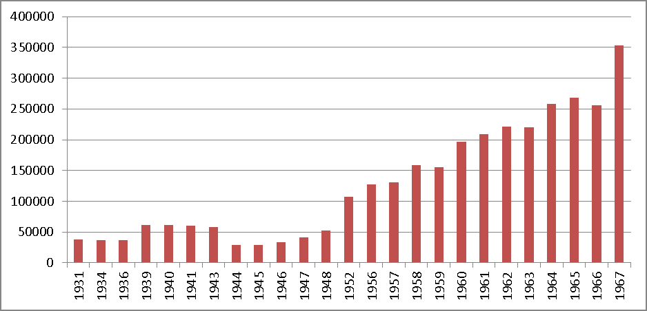 Si volve­mos a ver el últi­mo grá­fi­co, se puede obser­var que al incre­men­to que señalan los inge­nieros a prin­ci­p­ios de la déca­da de 1950 fue dupli­ca­da una déca­da después y hacia fines de la déca­da de 1960 se trip­li­can los 100.000 vehícu­los que eran trans­porta­dos por las bal­sas en el trayec­to Paraná- San­ta Fe.
