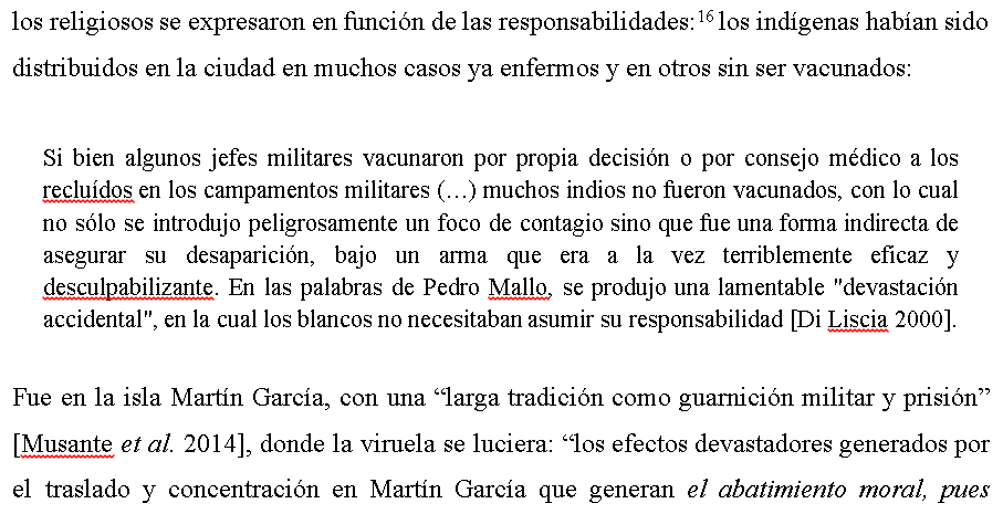 Las citas textuales en el cuerpo del texto cuya extensión sea igual o mayor a cuatro líneas deberán ser encajonadas con 1 cm en cada uno de sus márgenes. La letra debe ser reducida 1 punto. El interlineado debe ser de 1,15. Asimismo se debe dejar un espacio [Enter] ante y uno después de la cita, la cual no debe estar “entrecomillada”. Ejemplo de cita encajonada: